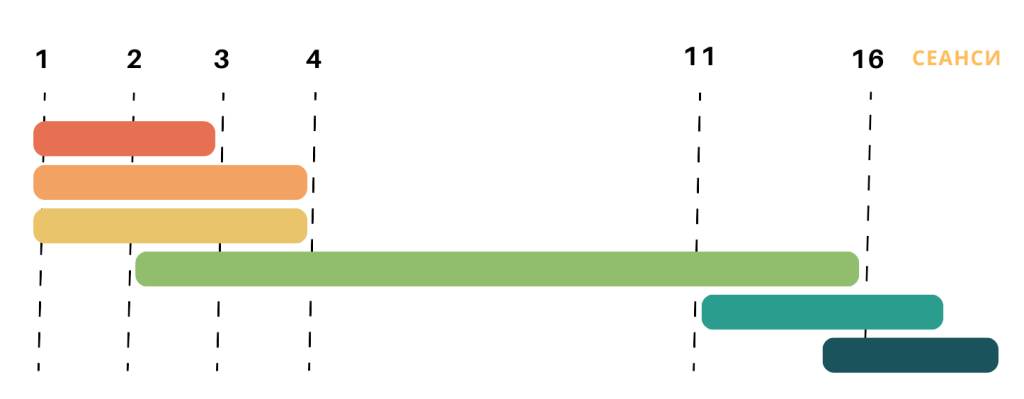 Тривалість роботи визначається індивідуально під час першої консультації. Зазвичай для перших помітних змін або вирішення конкретного запиту достатньо від 4 до 16 зустрічей. Якщо ж ваш запит стосується глибинних особистісних змін або складних ситуацій, процес може потребувати більше часу