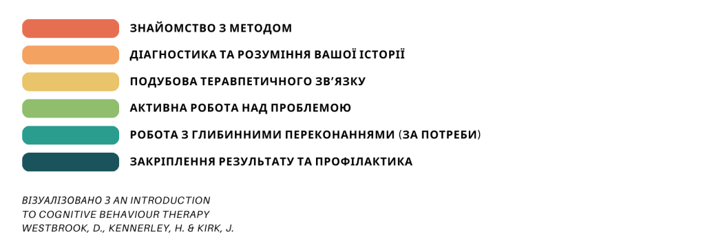 Перша зустріч присвячена знайомству: ви розповідаєте про себе, а я — про свій підхід та метод КПТ, щоб ви зрозуміли, наскільки він вам підходить. Ми проведемо первинну діагностику проблеми та намітимо план дій. Зверніть увагу, що психологічні зміни — це процес, тому для стійкого результату варто налаштуватися на курс від 4 сесій