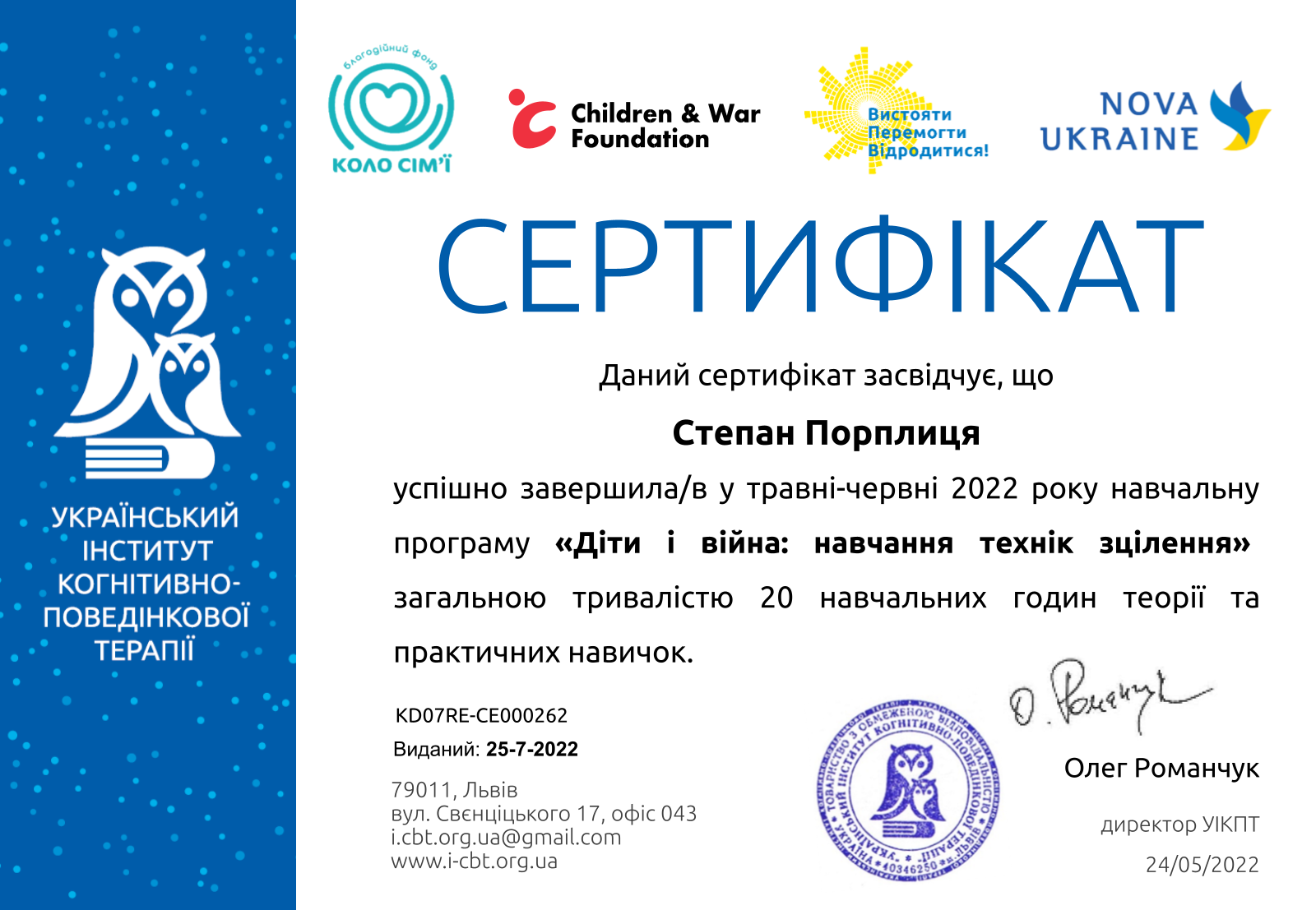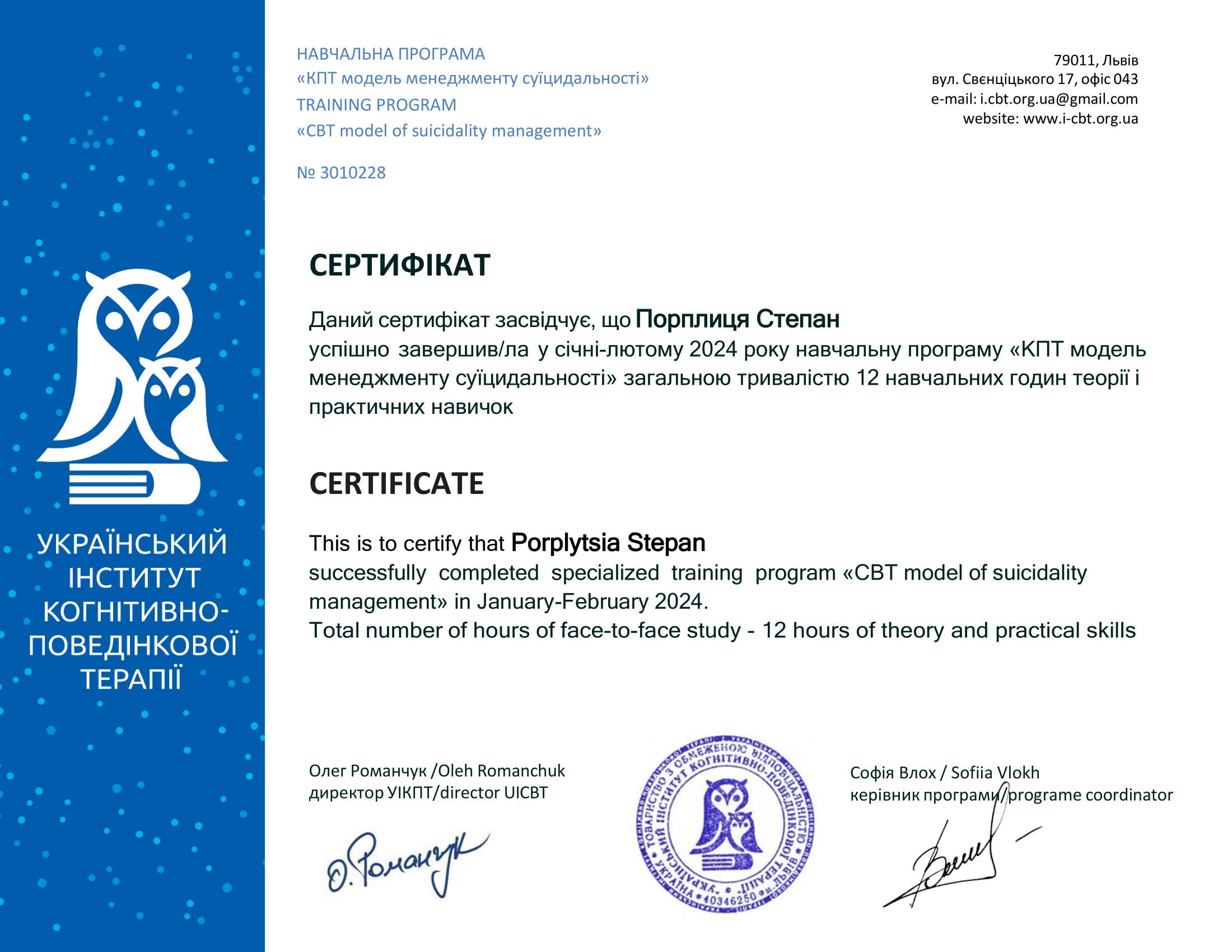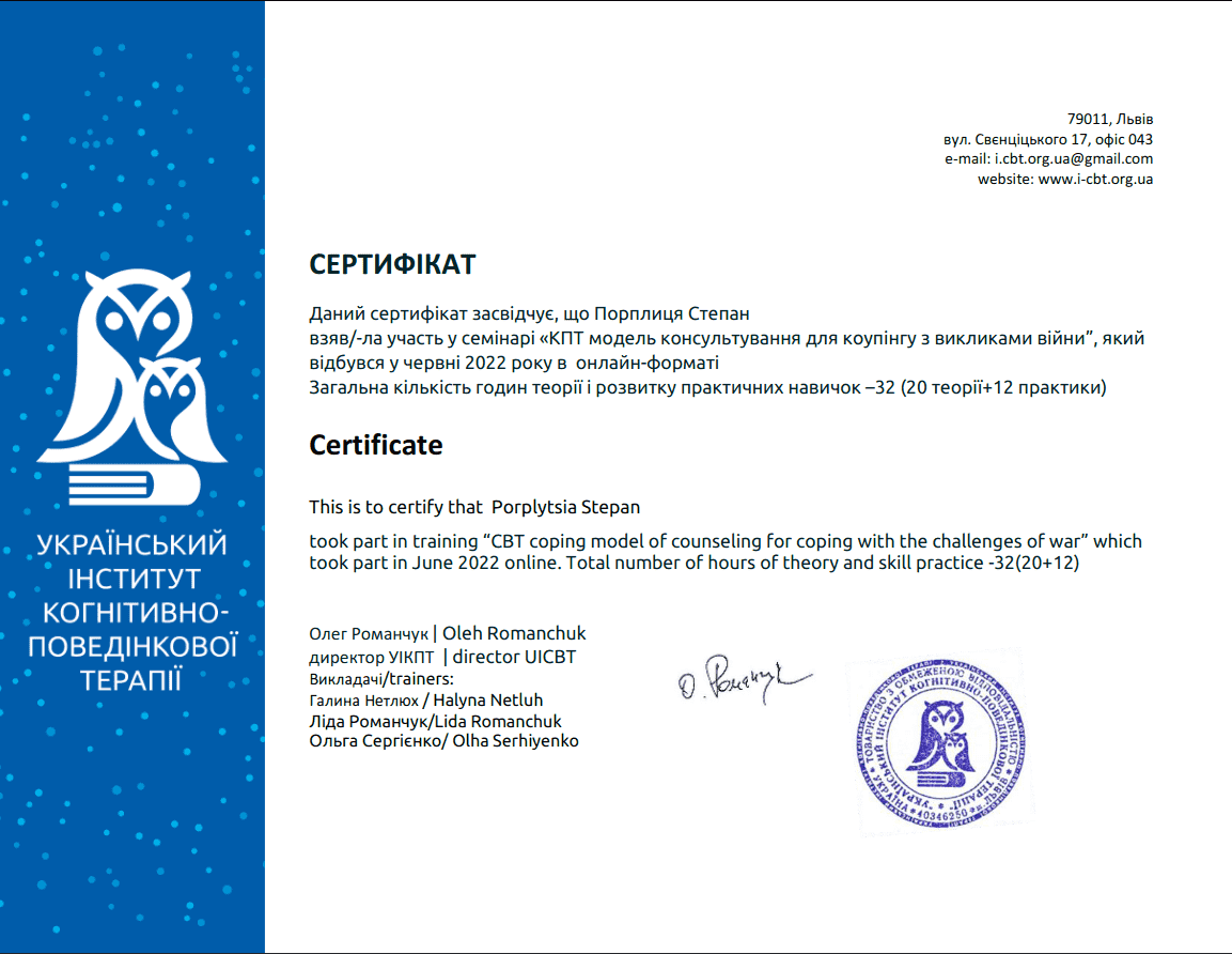 Український інститут когнітивно-поведінкової терапії (менеджемeнт суїцидальності, КПТ модель консультування для коупінгу з викликами війни, війна — навчання технік зцілення)