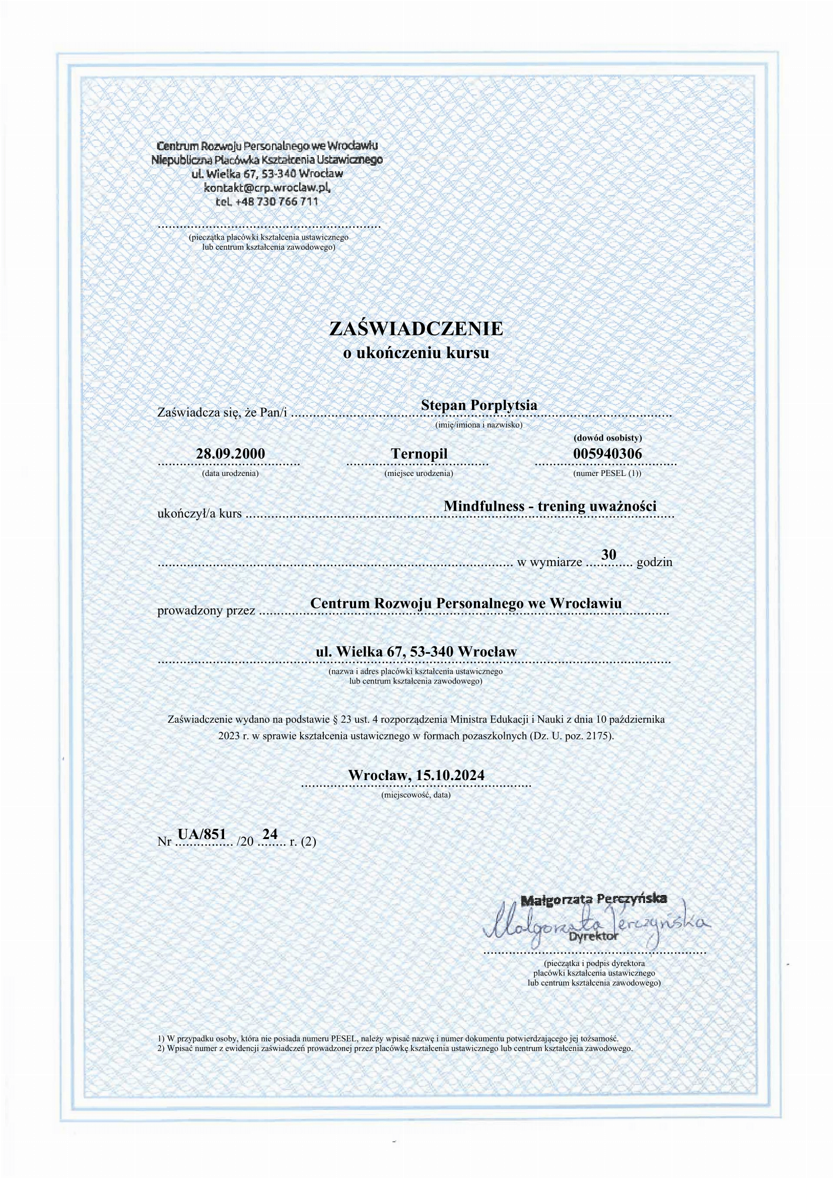 Центр персонального розвитку у Вроцлаві (психотравматологія, майндфулнес, КПТ при роботі із деперсією та тривогою, психологія дитини)