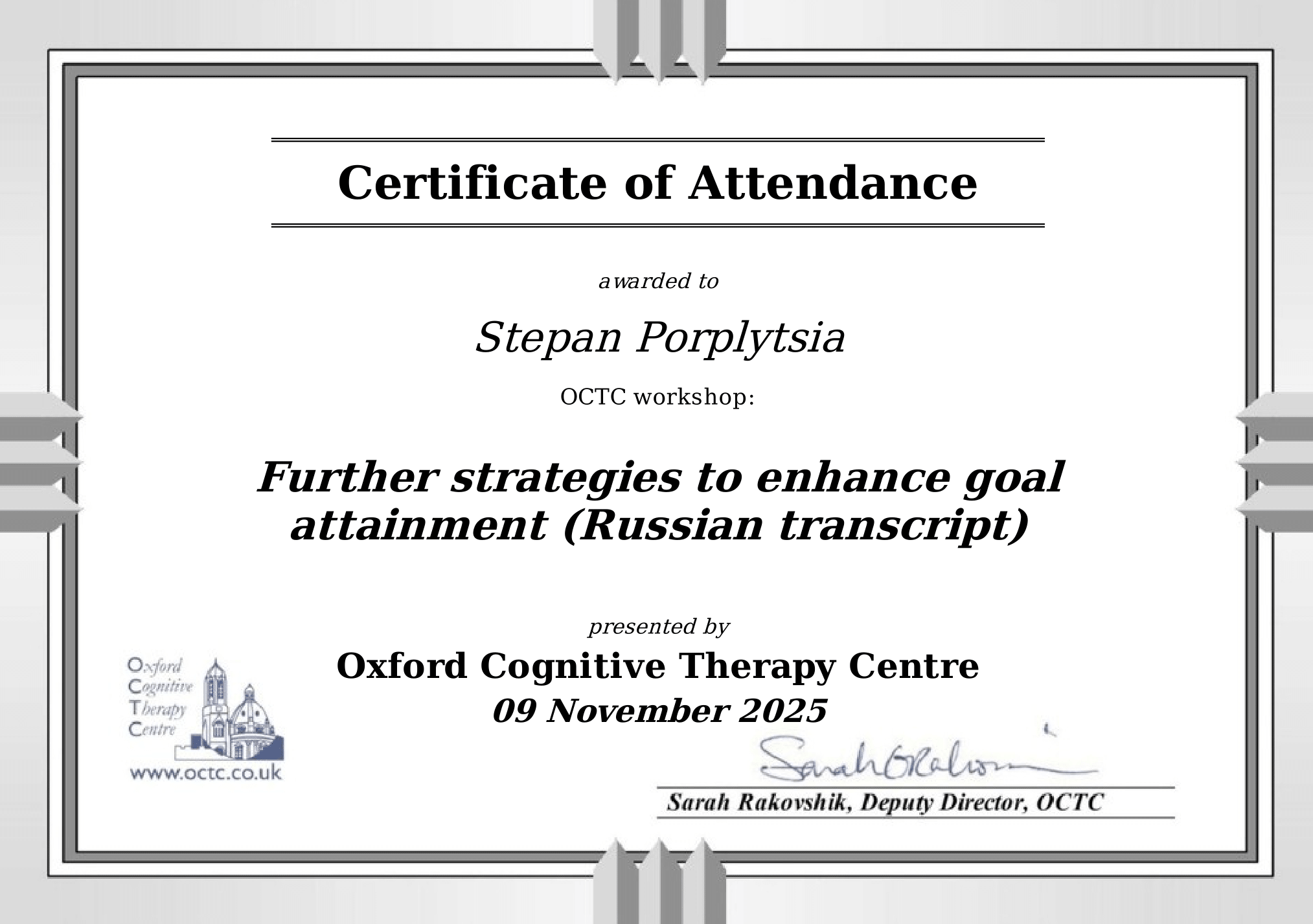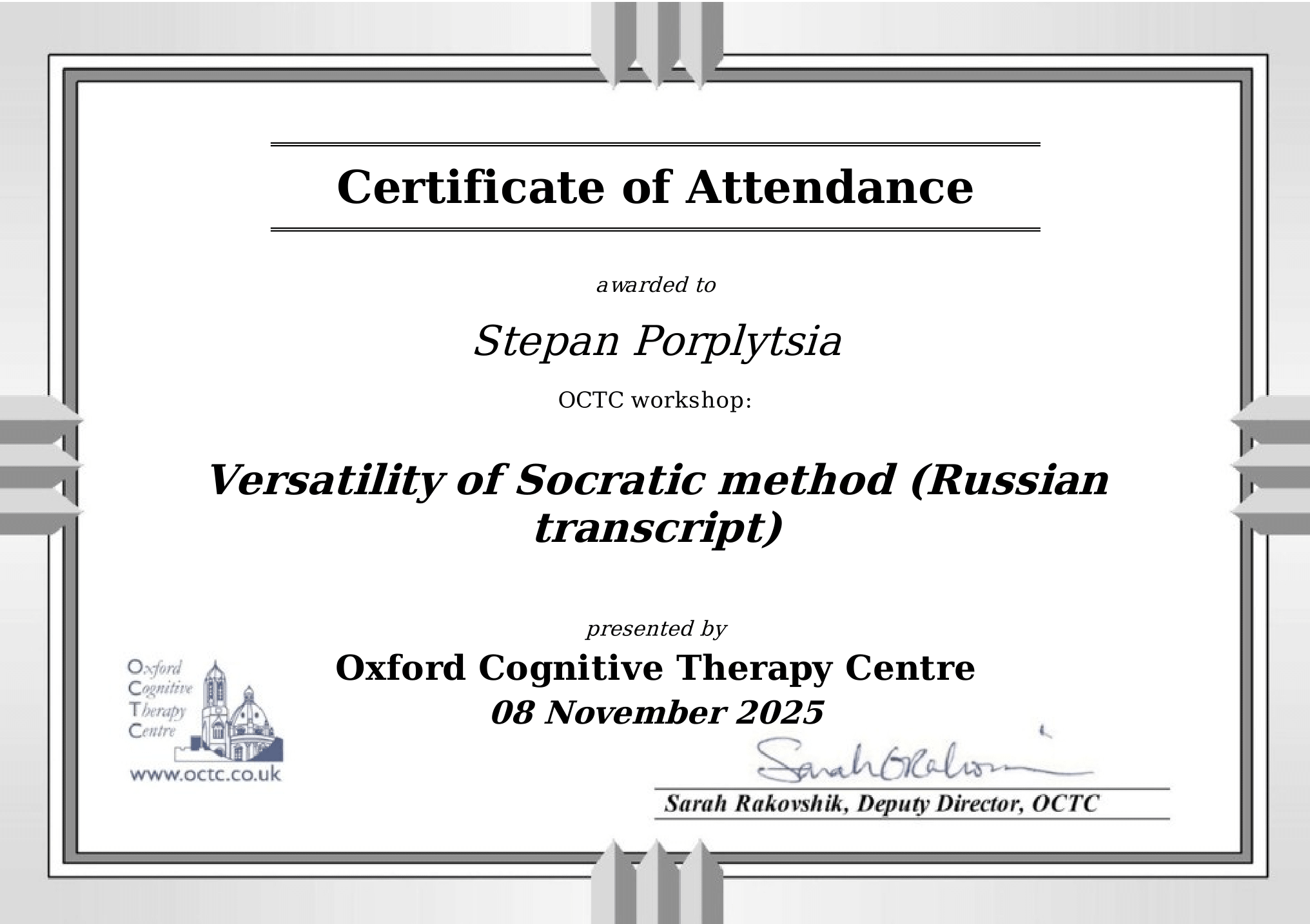 Оксфордський центр когнітивної терапії (Робота із глибинними переконаннями, Метод Сократа, лікування панічного розладу, стратегії для покращення досягнення цілей, переписування тривожних спогадів при агорафобії, когнітивна модель ОКР та схема лікування, складні оцінки та поведінкові експерименти)